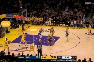 转播方回放详解湖人第三节最后一攻,詹姆斯突分八村塁三分命中。