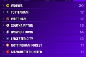 上赛季以来英超主场输球场次榜:狼队20场最多,热刺17场次席